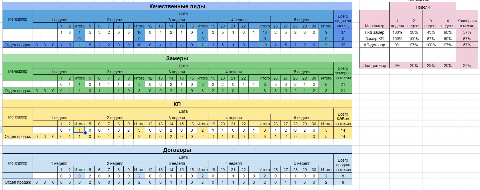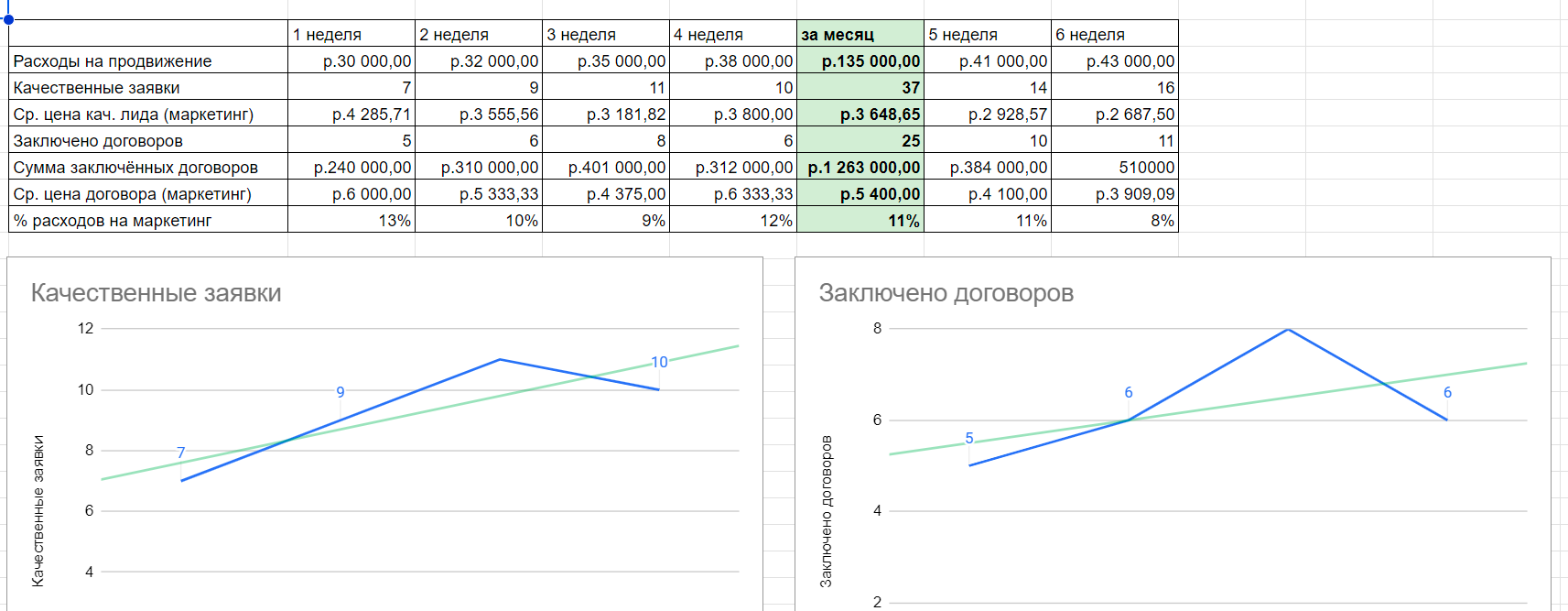 За неделю и месяц Расходы на продвижение Количество качественных заявок Средняя цена качественной заявки Сумма и количество продаж Средняя цена договора Какой % расходов на продвижени